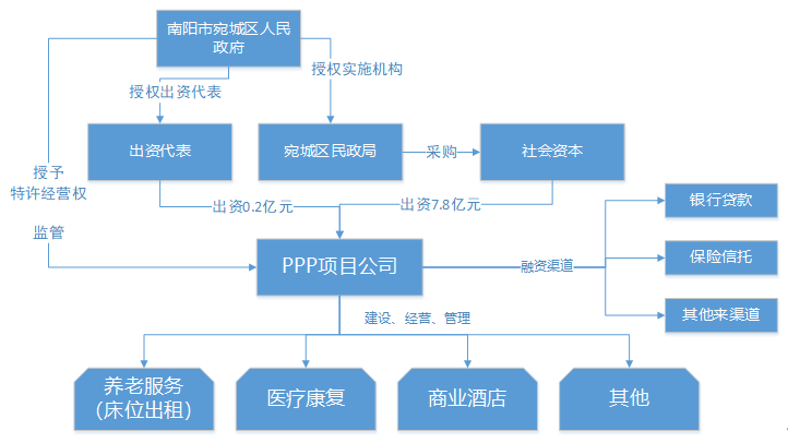 项目以BOO特许经营的方式运作,南阳市宛城区政府授权宛城区民政局作为实施机构,与社会资本组建PPP项目公司。通过授予项目公司特许经营权,使项目公司投资建设老年福利服务中心,并持续运营管理。合作期限为项目的建设期和运营期,本项目计划2015年中旬开工建设,建设期至2019年底。