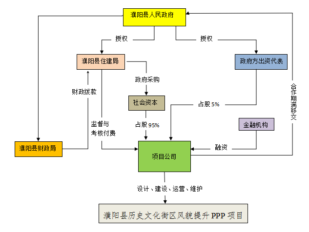 2)投融资结构:濮阳县政府授权政府方出资代表,与社会资本共同组建项目公司。政府方所持股份比例为5%,社会资本所持股份比例为95%。
