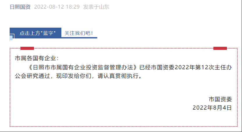 2、日照市国资委印发《日照市市属国有企业投资监督管理办法》