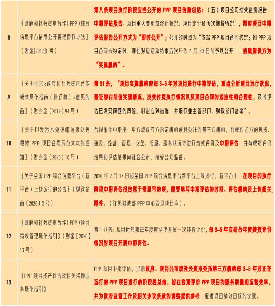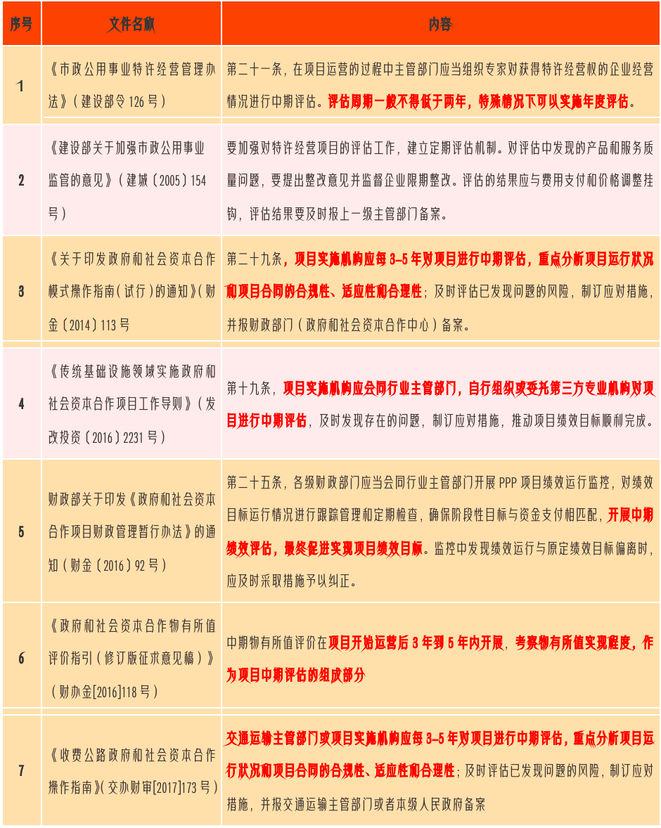 伴随着财金《关于推广运用政府和社会资本合作模式有关问题的通知》(财金[2014]76号)要求》《财金[2015]21号关于印发《政府和社会资本合作项目财政承受能力论证指引》的通知》等PPP相关政策的陆续出台,PPP正式登上历史舞台,与此同时,伴随着近几年PPP业务发展,前期实施的各种PPP项目已经陆续进入运营期,更为早期的PPP项目甚至已经运营数年,即将进入项目中期评估阶段。