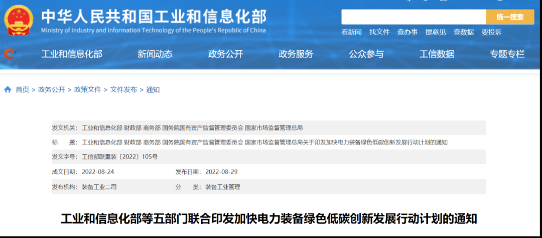 1、工业和信息化部、国务院国资委等五部门联合印发《加快电力装备绿色低碳创新发展行动计划的通知》