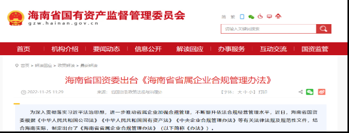 近年来,海南省国资委高度重视省属企业合规管理工作,先后出台了《关于进一步深化法治国企建设的实施意见的通知》《关于开展省属企业合规管理工作的通知》等文件,要求省属企业加快建立起全面覆盖、全员参与、职责清晰、协同联动、务实高效的合规管理体系。在此基础上,海南省国资委总结经验,制定出台《办法》,必将进一步推动国有企业深化合规管理工作,保障企业加快改革步伐,实现高质量发展,为海南自由贸易港建设提供法治保障。