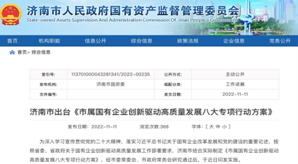 为深入学习宣传贯彻党的二十大精神,落实习近平总书记关于国有企业改革发展和党的建设的重要论述,按照省委、省政府关于国有企业创新驱动高质量发展工作部署要求,济南市结合实际制定《市属国有企业创新驱动高质量发展八大专项行动方案》,经市委常委会、市政府常务会研究通过后,于近日印发实施。