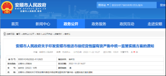 5、《安顺市人民政府关于印发安顺市推进市级经营性国有资产集中统一监管实施方案的通知》