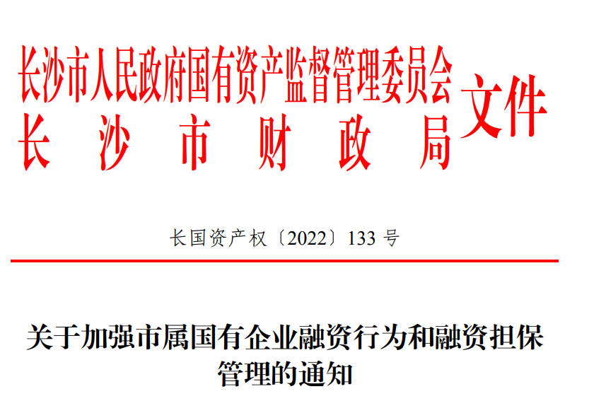 12月1日,长沙市财政局公布《关于加强市属国有企业融资行为和融资担保管理的通知》(长国资产权〔2022〕133 号)。通知旨在为加强市属国有企业融资行为管理,进一步规范融资担保管理,防范和控制融资风险,促进企业合理选择融资方式、拓展融资渠道、降低融资成本,维护国有资产权益。
