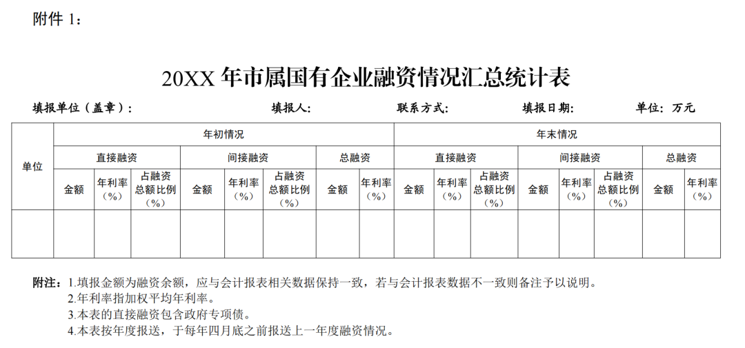 (二十二)市属国有企业应在每年4月底之前向市级国资监管机构报送上一年度的融资分析报告(应包含20XX年市属国有企业融资情况汇总统计表,样式见附件1)和融资担保执行情况,并将本年度经集团董事会审议通过的年度融资计划和年度融资担保计划报市级国资监管机构备案。