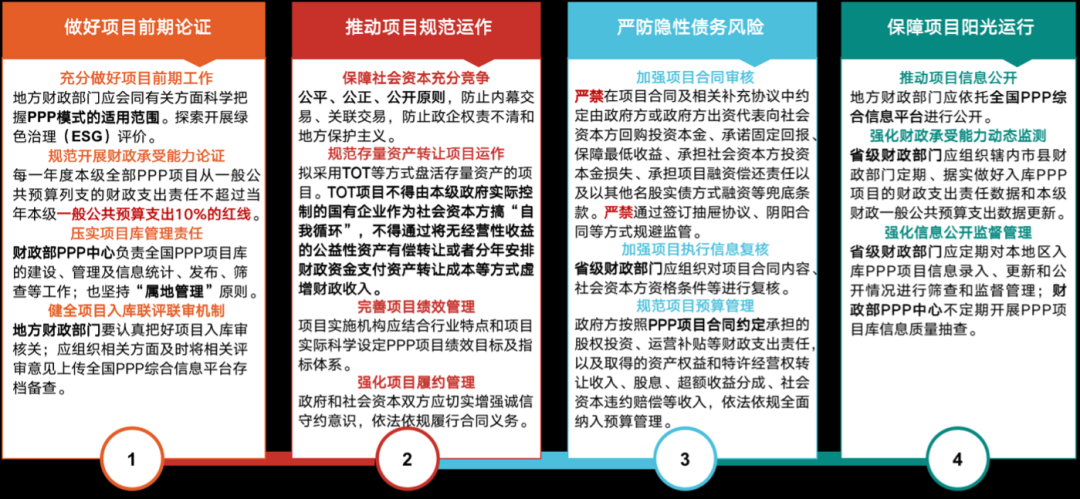 《通知》共涉四方面十四条。一是做好项目前期论证,二是推动项目规范运作,三是严防隐性债务风险,四是保障项目阳光运行。主要内容如下图所示: