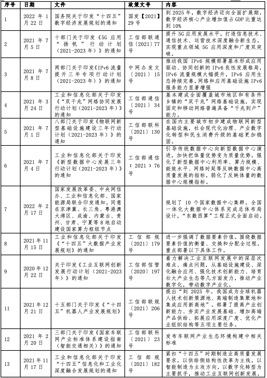 这与新基建发展不谋而合,根据国家发改委创新和高技术发展司司长对新基建内涵的阐述,新基建主要包括信息基础设施、融合基础设施、创新基础设施。数字经济为我国经济发展带来新动能,也为新基建的推进提供的技术可行方案,而新基建也成为数字经济发展的重要抓手,如“数字产业化”对应“新基建”的信息基础设施、“产业数字化”对应“新基建”的融合基础设施。《规划》提出“到2025年,数字经济迈向全面扩展期,数字经济核心产业增加值占GDP比重达到10%”,在数字经济蓬勃发展的背景下,必然也将迎来新基建的风口