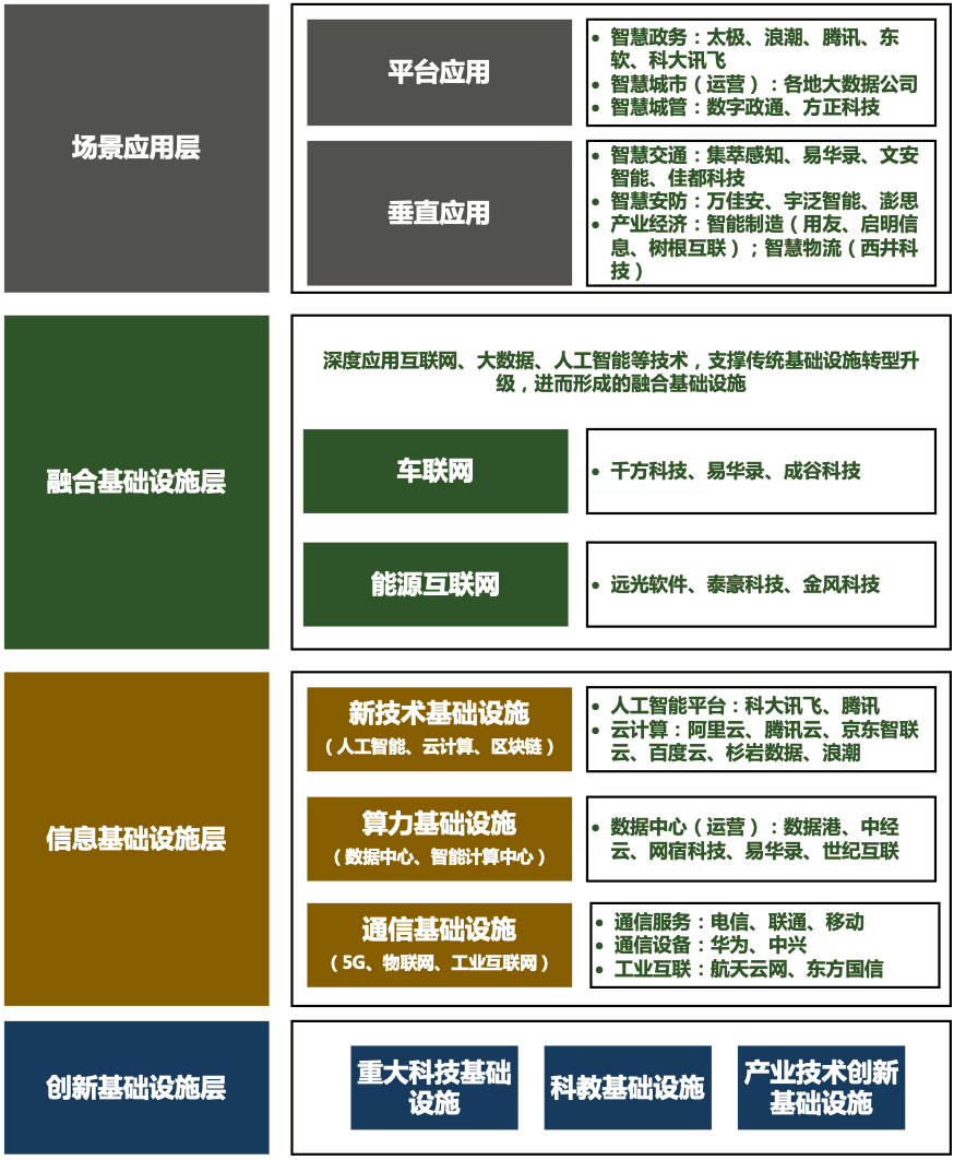 智慧城市作为新基建重要的平台应用领域之一,已开始由试点推进向全面铺开转变,由重建设向重长效运营转变。在转变过程中,由于智慧城市并非传统的信息系统项目的简单集成,它的建设需要长期运营和迭代升级,这就需要专门的团队对城市综合平台、垂直功能平台等产生的数据、信息进行专门的运营与监测,但是考虑到部分城市运营数据的隐私性与安全性需求,目前大部分城市通过成立大数据局,并在此基础上,组建大数据公司、或引入本地化专业运营企业的方式统筹推进。根据各地实践情况,我们发现国资系运营商占比较高,主要包括两大类:一是本地国资系运营商,主要通过成立国有独资智慧城市运营商,推进项目的持续运营,如作为雄安新区信息化与“数字城市”创新发展主要建设力量的中国雄安集团数字城市科技有限公司;二是政府合作类运营商,主要通过引入专业化企业,成立政企合资公司的方式推进,不过这种类型的运营商的发展策略与拟合作的企业类型息息相关,如选择与中国移动、中国联通合作成立的丝绸之路信息港股份有限公司,业务主要聚焦于城市网络运营、数据中心运营等;选择与阿里巴巴合作成立的数字郑州科技有限公司,业务发展主要着力于以城市大脑平台建设为核心辐射的产业生态联盟的推进。