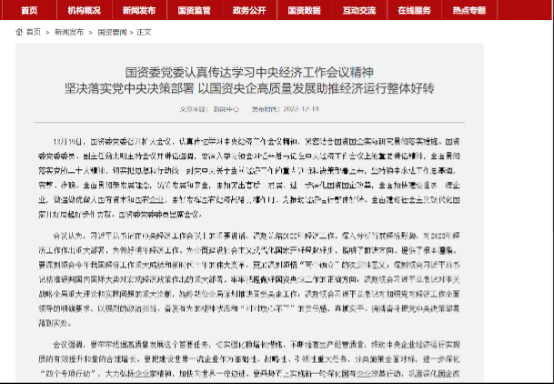 1、国资委党委认真传达学习中央经济工作会议精神:坚决落实党中央决策部署 以国资央企高质量发展助推经济运行整体好转