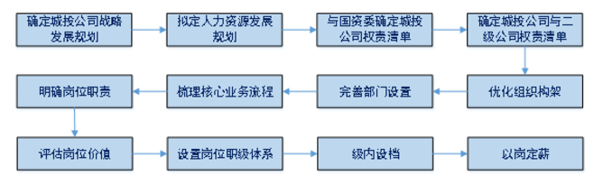 薪酬的设计终端在岗位薪酬,设计前提一是确定城市国企的战略发展方向和人力资源规划,二是拥有薪酬设计自主决定的权限和主观能动性。因此薪酬设计第一步,需明确城市国企的战略规划和人力资源规划,确定城市国企的薪酬策略;其次需要就企业管理方面与上级部门沟通确认城市国企的权责清单,权责明确后对公司组织架构、部门设置进行合理优化,为薪酬绩效改革搭建龙骨。