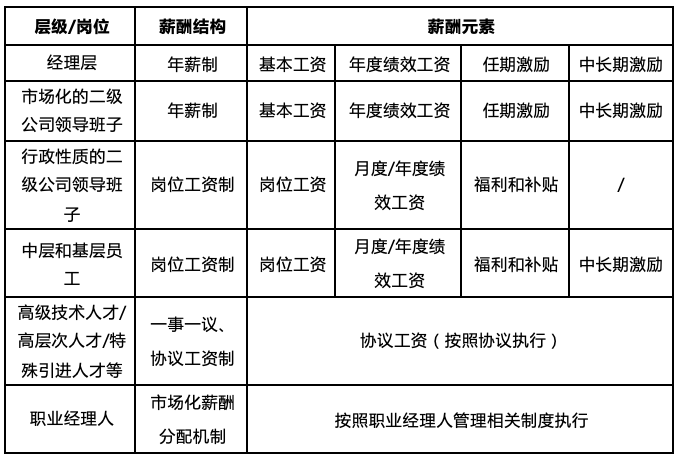 为实现城市国企薪酬分级分类管理,调整好内部收入差距,需要建立合理、科学和多元化的薪酬结构。对企业负责人、高级管理人员、高级技术人员、特殊引进人才、中层干部、一般员工设置不同的薪酬结构。如对企业负责人施行年薪制;高层次人才和高级技术人员薪酬一事一议,实行协议工资制;中层及一般员工采取岗位工资制,对实行职业经理人的,引入职业经理人任期与考核制度。