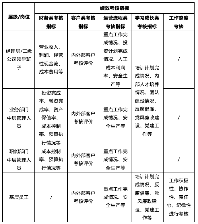 针对城市国企不同层级、不同岗位性质建立城市国企绩效考核指标库,对绩效考核指标的定义、计算公式、考核方法进行详细说明,保证在绩效考核实施过程中有据可依。根据不同层级不同岗位性质和年度/月度工作计划的考核侧重点不同,设定不同的考核指标和考核权重。城市国企不同层级、不同岗位性质的绩效考核指标模型如下: