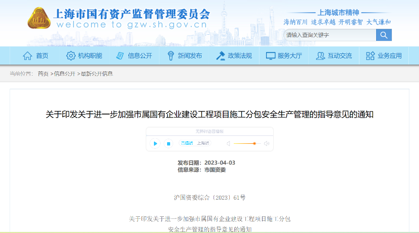近日,上海市国资委、市住房城乡建设管理委、市应急局联合印发《关于进一步加强市属国有企业建设工程项目施工分包安全生产管理的指导意见》,现将有关政策说明如下: