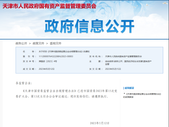 官网链接:https://sasac.tj.gov.cn/ZWGK1142/zcwj/wjwj/202305/t20230516_6240889.html