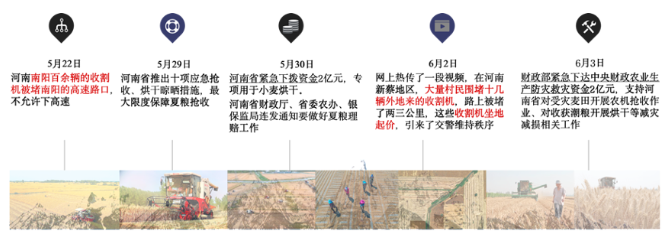 从各项公开资讯,我们发现在河南小麦风波事件中,农户的影子无处不在,面临收割机供给不足的情况,他们充分利用各种资源寻找收割机,甚至直接去高速路口拦截。而各地的供销社、农机合作社等基层组织缺位,政府部门相关措施滞后性更是明显。如“南阳百余辆的收割机被堵南阳的高速路口,不允许下高速”事件,以及随后的“农机调度、跨区农机保障”政策,本已提前设置的经营机制、预见性机制、应急预警机制 1,均在负面事件发生后姗姗来迟。