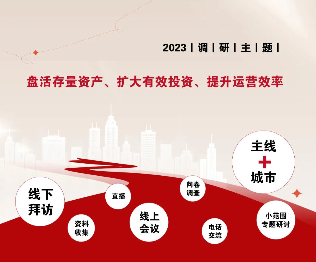 本次调研主要围绕主题——盘活存量资产、扩大有效投资、提升运营效率。调研形式除了传统的延续传统的线下拜访、线上会议、小范围专题研讨、直播、电话交流、问卷调查、资料收集等调研方式以外,还新增了“主线+城市”的调研活动,目的是为了使调研更有深度、更具针对性——带着城投企业关心的专题和问题,前往最佳实践城市,对其商业模式、解决路径、实操难点等进行深入了解。