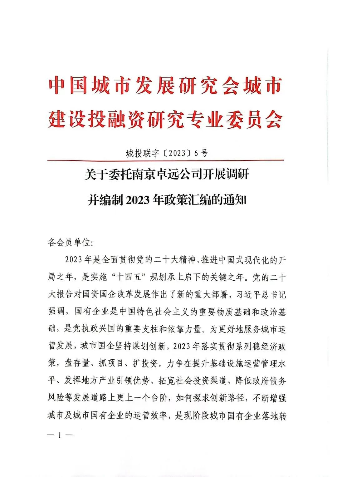 附件1:全国城投协会关于委托南京卓远开展调研并编制2023年政策汇编的通知