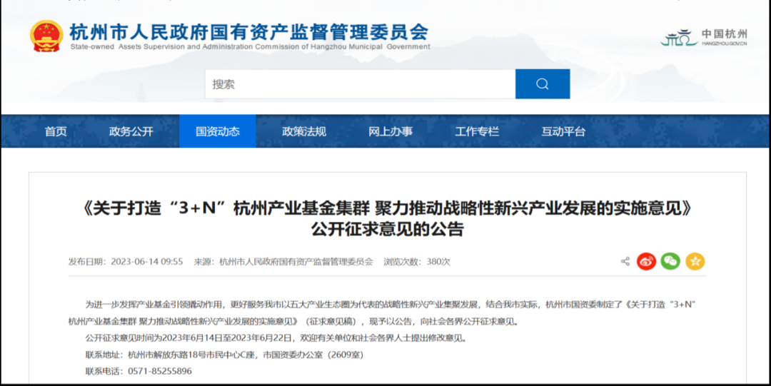 1、杭州市国资委印发《关于打造“3+N”杭州产业基金集群 聚力推动战略性新兴产业发展的实施意见》