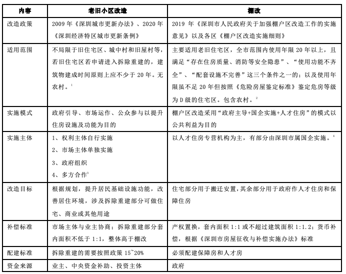 目前,部分地区在老旧小区的认定标准与改造内容上的界定还没有形成共识,所以在实践过程中对于相关边界的认定存在一定问题,本文以城市更新先行城市深圳为例对老旧小区改造与棚改边界上加以区分,其在政策上对于二者在适用对象、实施模式、资金来源、改造目标上有着较为清晰的界定,具体内容如下所示: