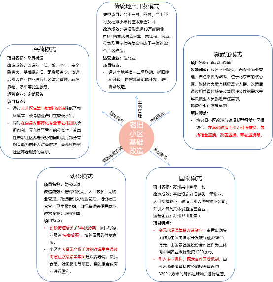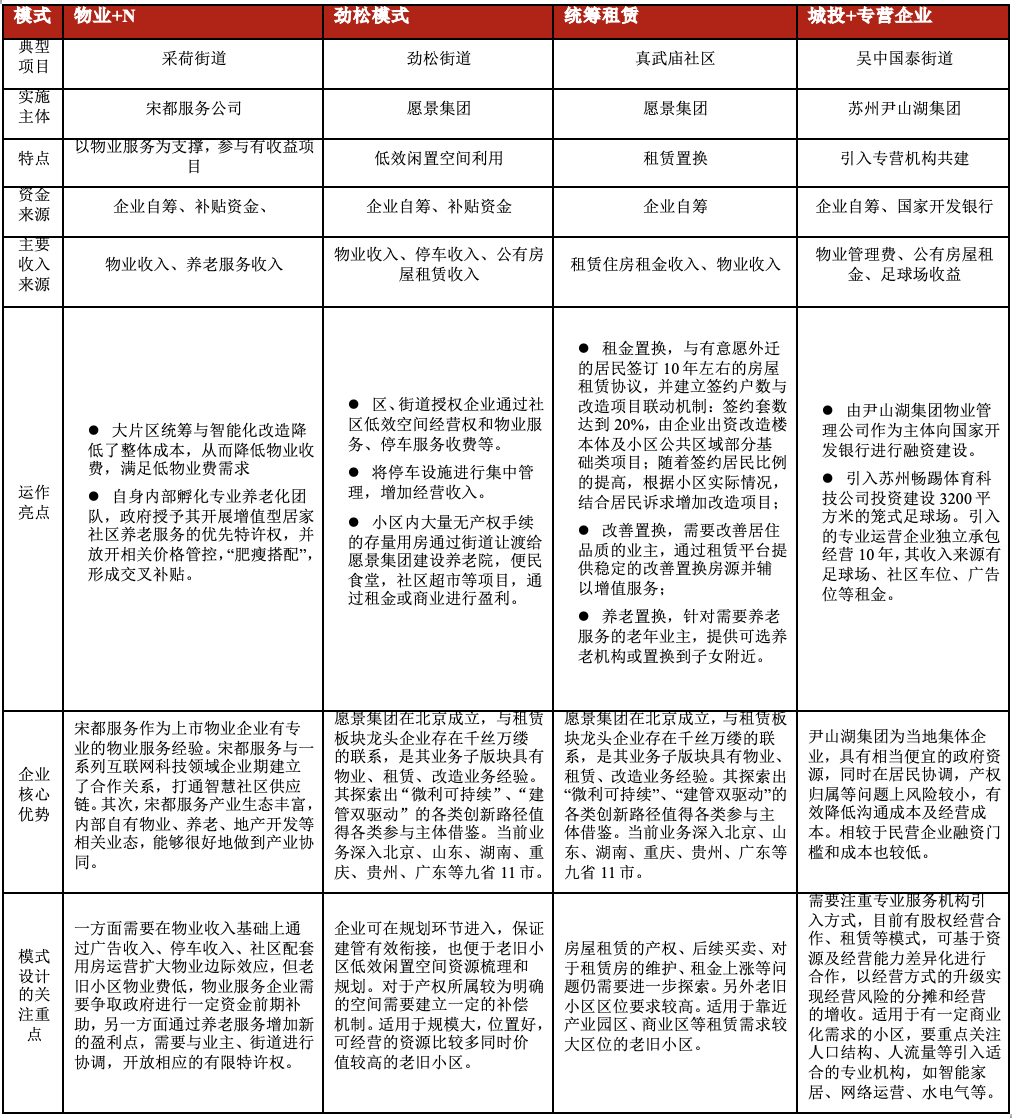 老旧小区参与企业有房企、物业、城投、智慧家居、专业经营企业等,其中多数是政府背景的城市国企。在实践过程中大部分地区往往授权当地城市国企进进行老旧小区改造相关业务统筹,其他类型企业进入当地市场需要寻求与地方城市国企进行深入合作。在禁止大拆大建背景下,房企、物业、建筑企业等传统房产开发企业多从物业入手,在建筑施工基础上配以物业管理,以此作为老旧小区业务盈利点,但基础物业收入往往难以覆盖巨大投资成本,难以持续经营。相较于传统房地产改造,老旧小区改造出现了一些新玩家,带来了创新的商业模式,如新型社区管理、闲置租赁、智慧管理系统、智能家电等。从现行经验来看,当前老旧小区改造主要有宋都服务为例的“物业+N”的物业主导模式,愿景集团为例的置换低效闲置空间经营权的“劲松模式”以及其空房租赁置换的“统筹租赁模式”,苏州尹山湖集团为例地引入专业运营机构的“城投+专营企业”四大类创新模式,各类模式可综合使用。