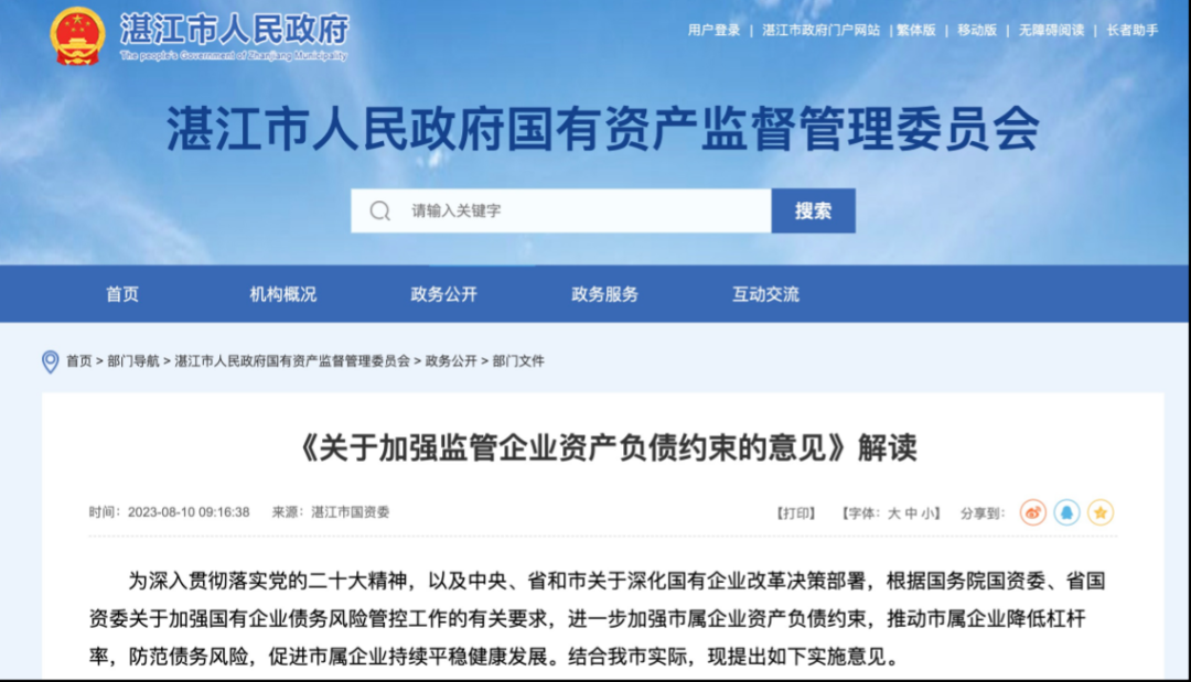 1、湛江市印发《关于加强监管企业资产负债约束的意见》