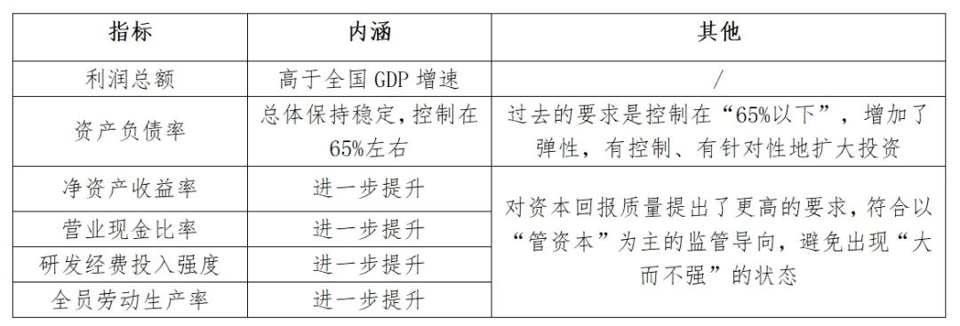 2023年年初,国务院国资委召开了中央企业负责人会议,提出优化中央企业经营绩效考核指标体系,从“两利四率”调整为“一利五率”,目标是“一增一稳四提升”。一增,是确保利润总额增速高于全国GDP增速;一稳,是保持资产负债率总体稳定;四提升,是进一步提升净资产收益率、研发经费投入强度、全员劳动生产率、营业现金比率四个指标。