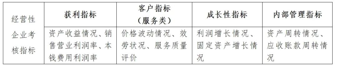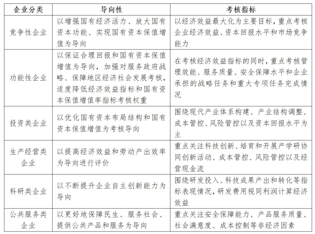 其中,根据企业属性来看,对于竞争性企业,以增强国有经济活力、放大国有资本功能、实现国有资本保值增值为导向,提高企业经济效益、资本回报水平等指标的权重占比;对功能性企业,适度降低经济效益指标和国有资本保值增值率指标考核权重,重点考核管理效能、服务质量、安全保障水平和企业承担的战略任务和重大专项任务完成情况;根据企业行业特性来看,对于投资类企业,强化现代产业体系构建、产业结构调整、成本管控、风险管控以及资本回报水平等情况的考核比重;对于生产经营类企业,要强化科技创新、培育和开展产学研协同创新活动、成本管控、风险管控以及经营现金流等情况的考核比重;对于科研类企业,要强化研发投入、科技成果产出和转化等情况的考核比重;对于公共服务类企业,要强化安全保障能力、产品服务质量、社会满意度、成本控制等情况的考核比重。