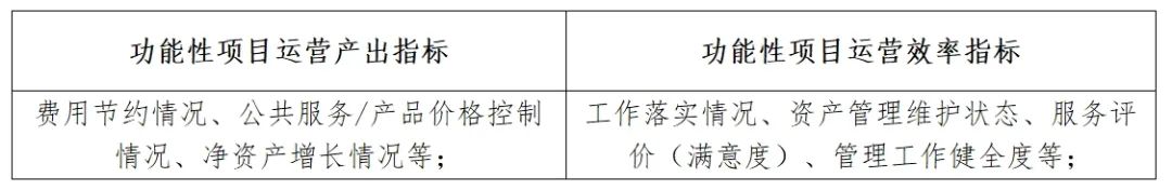 对于功能性项目经营产出考核内涵主要关注两方面内容,一是其经济产出,由于功能性项目一般较难产生经营效益,因此可以以成本控制为主,重点关注在保障相关工作正常完成时,所降低的人力物力消耗;二是其社会效益产出,作为非量化的考核内容,同时也是功能性项目最主要的价值,可以以城市战略支撑指数、幸福生活指数或其他的标志性评价内容作为产出依据。