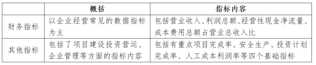 基本指标一般包括利润总额和经济增加值指标等经济指标。利润总额是指经核定的企业合并报表利润总额。利润总额计算可以加上经核准的当期企业消化以前年度潜亏,并扣除通过变卖企业主业优质资产等取得的非经常性收益;经济增加值是指经核定的企业税后净营业利润减去资本成本后的余额。除此之外在企业管理、队伍建设、工作开展合规性等方面,各类企业均可设置相关的考核指标内容。