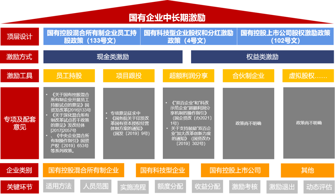 早在2019年11月11日,国资委印发的《关于进一步做好中央企业控股上市公司股权激励工作有关事项的通知》为央企股权激励打开了政策空间。目前,中长期激励已经形成了三大主要政策体系,即133号文、4号文和102号文,并在后续不断出台的配套或延伸政策文件,如《中央企业混合所有制操作指引》(国资产权〔2019〕653号)、《中央企业控股上市公司实施股权激励工作指引》(国资〔2020〕178号),针对超额利润的专项规划《“双百企业”和“科改示范企业”超额利润分享机制的操作指引》等。另外,在一些综合性的政策文件中也围绕中长期激励机制明确了灵活开展多种中长期激励的基本导向,如《百户科技型企业深化市场化改革提升自主创新能力专项行动方案》(国企改办发〔2019〕2号)等。