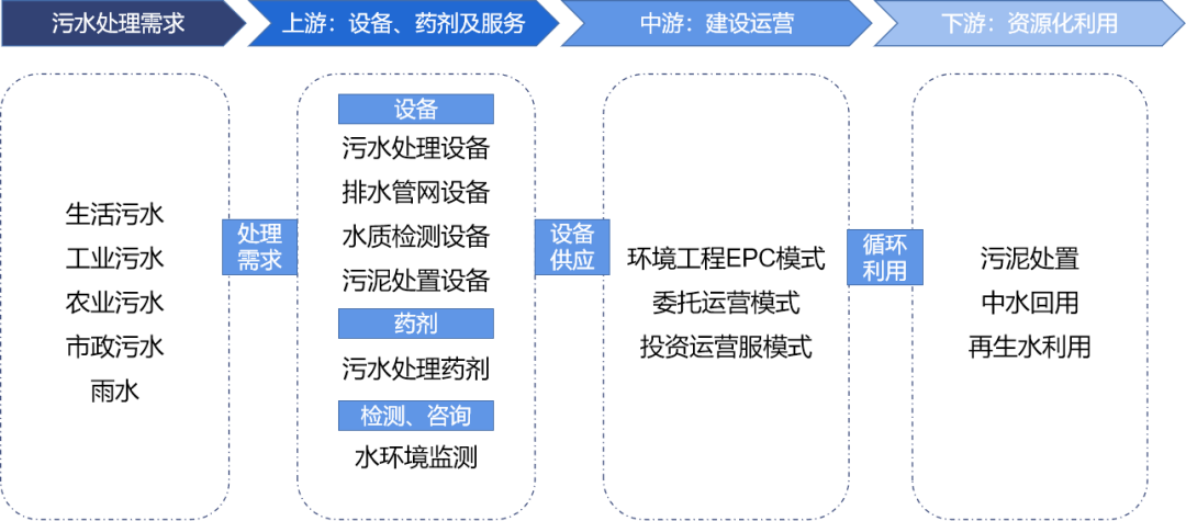 目前我国的污水处理产业链主要分为上游供应商与服务:污水处理设备、药剂材料供应、咨询服务、检测服务;中游建设运营商:工程施工及运营服务;下游资源化利用服务商:污泥处置、中水回用、再生水利用。污水处理建设运营商、资源化利用企业的毛利率相较于设备、药剂及检测服务商毛利率要高。目前多地积极推动污水处理厂-网-河一体化建设项目,对污水处理产业链上的企业提供的污水处理设备、运营管理模式、资金投入量等产品与服务都提出了新的要求,产业链上中下游一体化运营将成为未来企业转型主要方向。