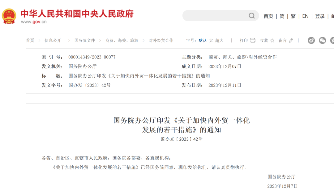 1.国务院办公厅印发《关于加快内外贸一体化发展的若干措施》的通知
