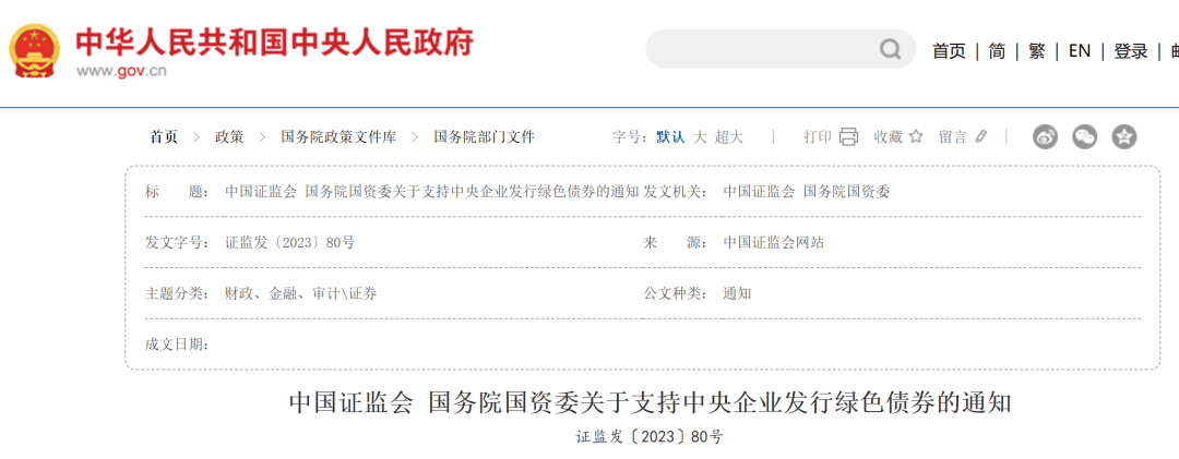 2、中国证监会 国务院国资委关于支持中央企业发行绿色债券的通知