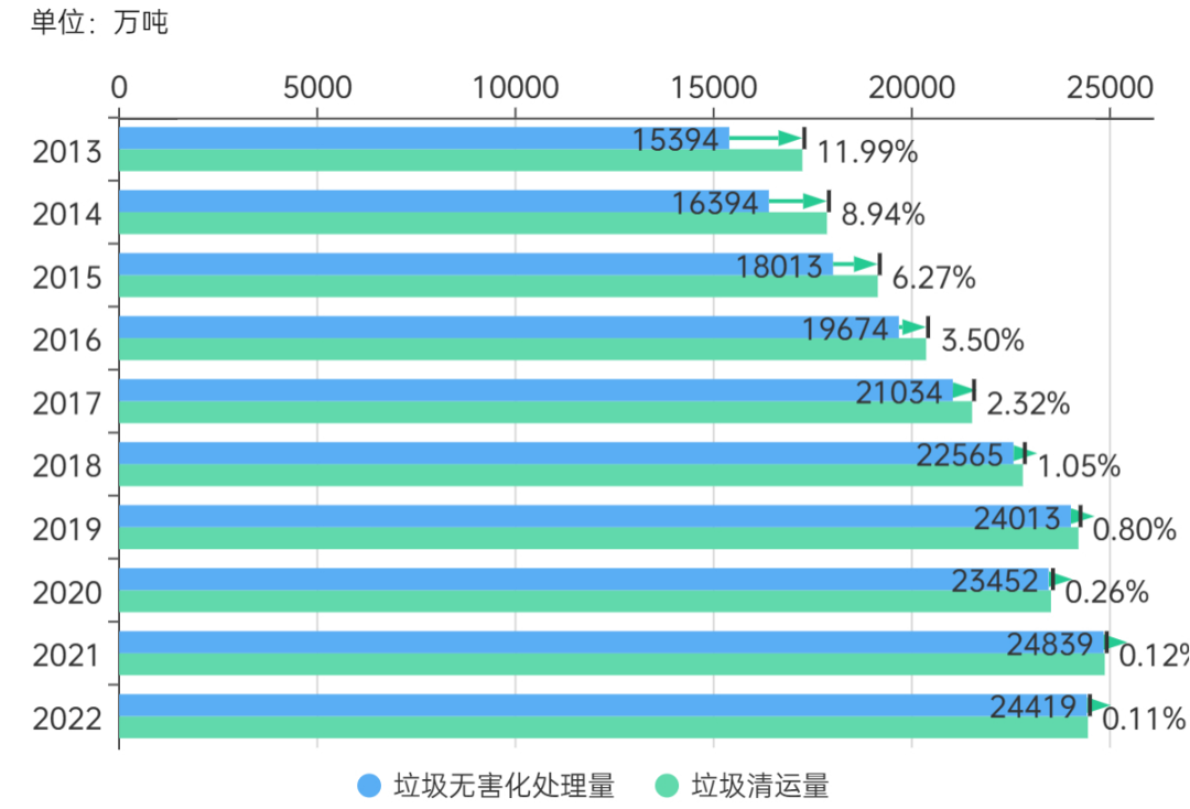 图1 2013年-2022年生活垃圾清运量级无害化处理量