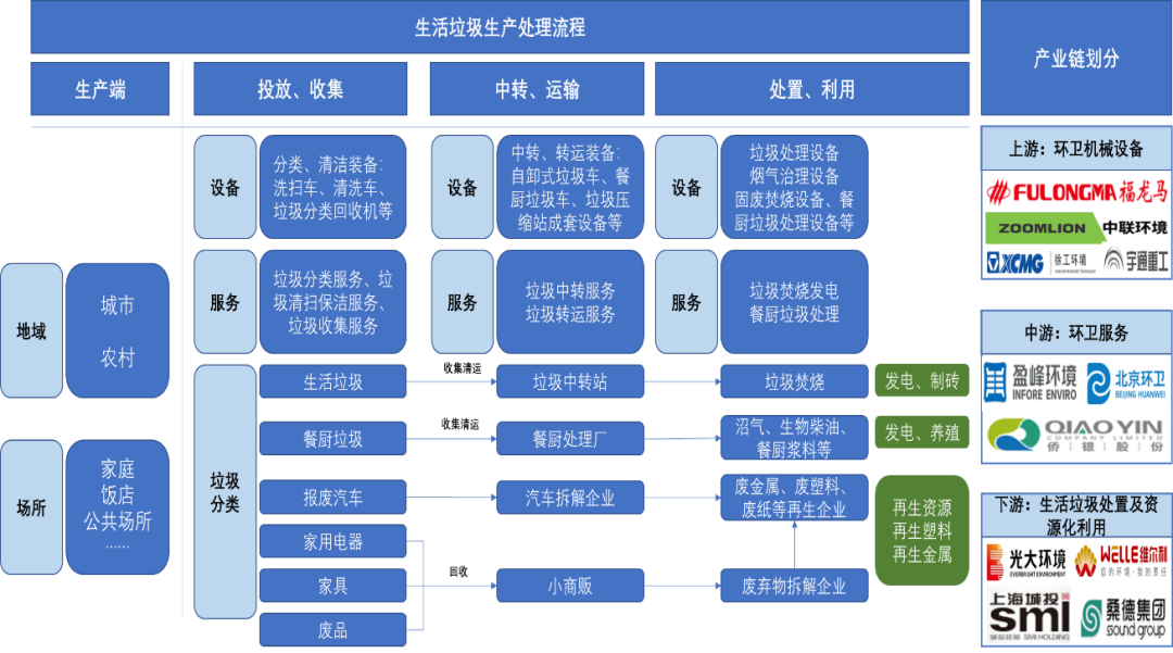 生活垃圾主要来源于日常生活所产生的各类垃圾,包括生活垃圾、餐厨垃圾等。当前随着人口增长及城镇化的推进生活垃圾产量不断提升,生活垃圾处理产业链日益成熟,从处理流程上来看,主要包括垃圾生产、垃圾投放收集、垃圾运输、垃圾处置四个环节,产业链大体可划分为上游环卫机械设备制造、中游生活垃圾清理收集转运,下游生活垃圾处置与资源化利用三大部分,下面主要从这个三个方面分析。