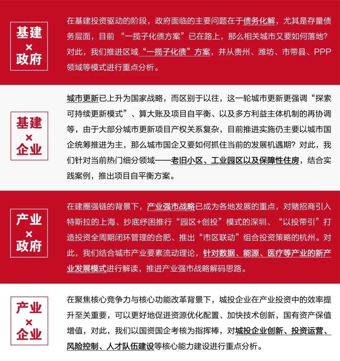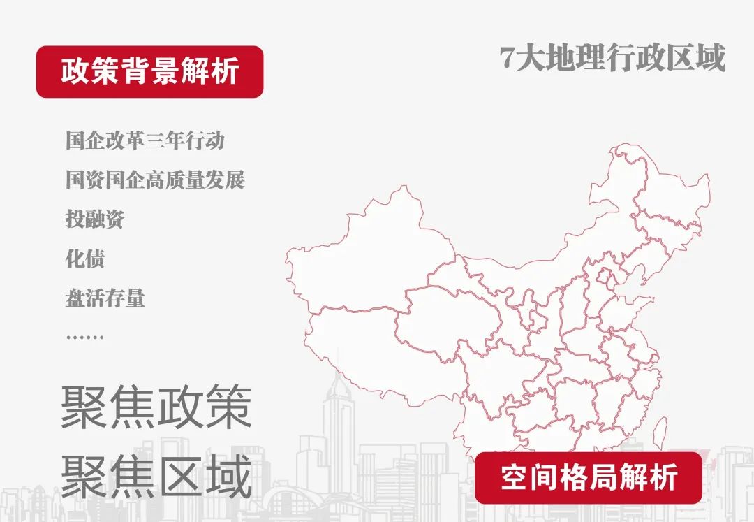 我们立足全国,从顶层设计、融资场景、投资场景、业务开展、内部管理等层面积极开展实地调研,深入剖析与解码城市国企的转型战略与模式,总结出城市化进阶的四象限模型与城市国企同频发展趋势和实践,以及十大重点产业典型案例。与此同时,我们依据对城市国企所处行业的长期舆情监测情况,以数据分析为抓手从空间布局层面推进对七大地理行政区域的现状解读,以期为城市投融资企业及行业发展的趋势预判提供更高价值的信息。