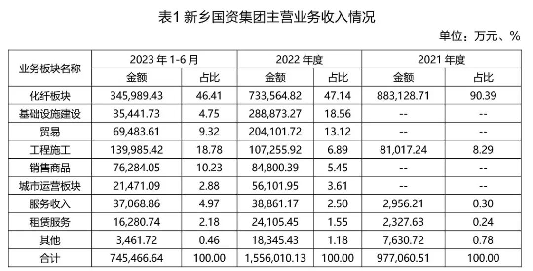 新乡国资集团自整合组建成立起,积极探索产业化转型发展,并取得了良好成效。从近年公开的财务报表中主营业务收入构成来看,化纤板块占比最高,2023年中报披露数据为46.41%;而城建类收入已控制在30%以下,由基础设施建设、工程施工收入两类构成,合计占比25%。即从收入统计数据来看,满足“城建类收入占总收入比重不超过30%”的认定标准。新乡国资集团在Wind中的分类标注为非城投,其主体信用评级为AAA。