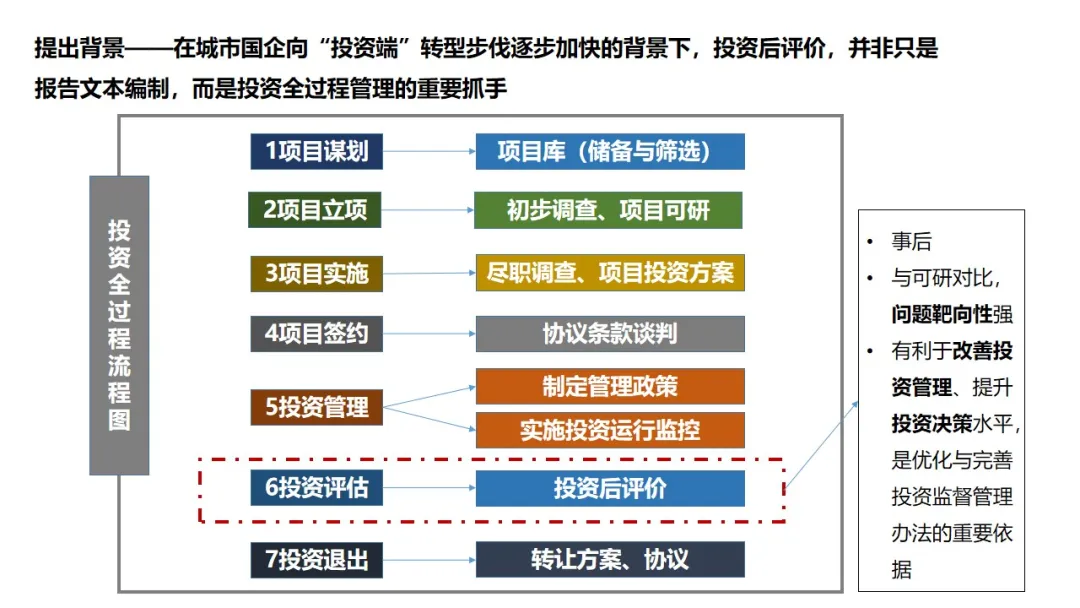在城市国企向“投资端”转型步伐逐步加快的背景下,投资后评价,并非只是报告文本编制,而是投资全过程管理的重要抓手。从后评价的内涵定义、后评价组织实施流程、后评价操作实务三个方面展开具体分析。