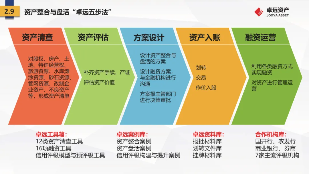 总结盘活存量资产的PPP模式、REITs模式、盘活存量与改扩建相结合、挖掘低效闲置资产价值、发行资产支持专项计划、产权交易、作价入股、兼并重组等8大路径的实操方法,详细分析14个具体实践案例。南京卓远特创资产整合与盘活“卓远五步法”:资产清查——资产评估——方案设计——资产入账——融资运营,提高广大城投企业工作效率;项目投融资工作三大流程:投融资方案与实施计划——建立投融资项目库——开展融资对接与项目实施,助力城投企业扎实谋划高质量项目工作。