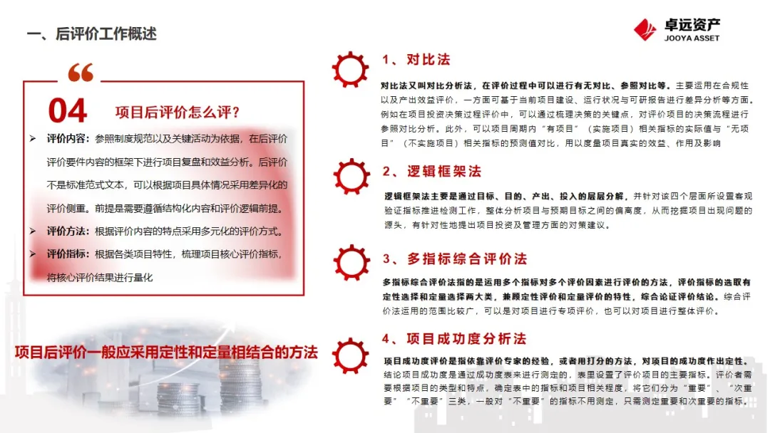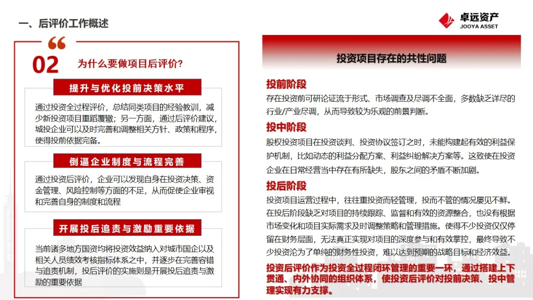 培训会上,南京卓远项目经理盛江灵作《成都产业集团2024年投资项目后评价》主题分享,盛江灵基于国资监管的规范要求与后评价开展实施难点,系统性的介绍了后评价项目“为什么评?”“评什么?”“怎么评?”的核心问题。基于各类投资项目的特点,从评价核心内容、评价侧重点分析以及评价方法的选择,进行分类总结,并详细阐述了各类评价项目在具体问题分析过程中的方式方法。
