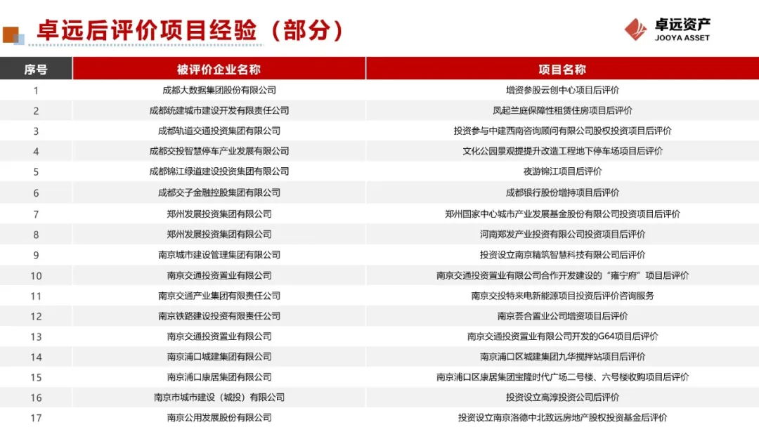 南京卓远作为十余年来服务于城市和城投企业发展的专业机构,致力于做“最懂城市的资产管理者,最懂城市国企的赋能者”,务实求创新,真切为客户,累计完成投融资业务100余个,管理咨询类项目500余个,完成基建咨询类项目600余个,其中积累了丰富的项目咨询经验。其中,为成都、南京、郑州等市、县、区国资委/办,城投企业提供投资全过程管理咨询(投前可研、投中评估、投后评价)项目50余个。卓远将持续发展和强化“对中国城市发展的理解与规律把握、对城市资源要素的整合与实操运营”两大核心能力,以提升客户满意度、解决客户实际需求为终极目标,赋能国资国企转型提升,全方位成就客户发展,助推城市经济高质量向前。