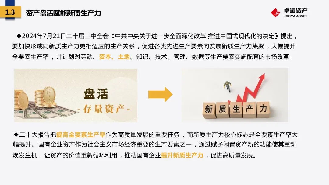 二十大报告把提高全要素生产率作为高质量发展的重要任务,而新质生产力核心标志是全要素生产率大幅提升。国有企业资产作为社会主义市场经济重要的生产要素之一,通过赋予闲置资产新的功能使其重新焕发生机,让资产的价值重新循环利用,推动国有企业提升新质生产力,促进高质量发展。