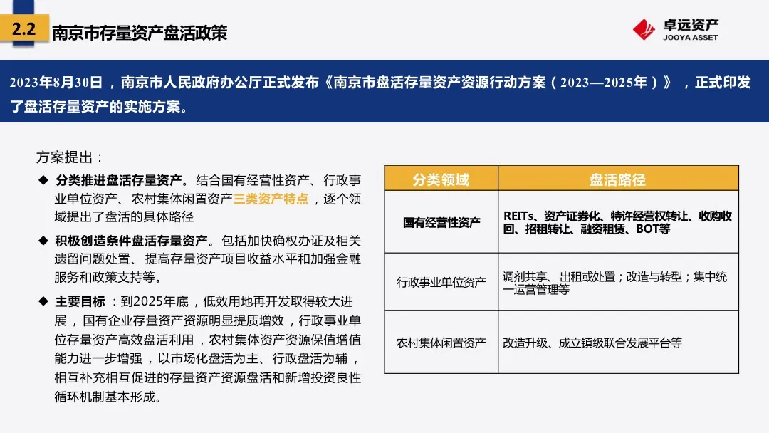 罗列了近年来国家层面存量资产盘活的相关政策,重点介绍了《江苏省进一步盘活行政事业性国有资产工作实施方案》的通知(苏财资[2023]52号)、南京市人民政府办公厅正式发布《南京市盘活存量资产资源行动方案(2023—2025年)》等政策,解读关于分类盘活存量资产、积极创造条件盘活存量资产、工作原则及目标、精准划定低效闲置资产范围等几方面的重点内容。