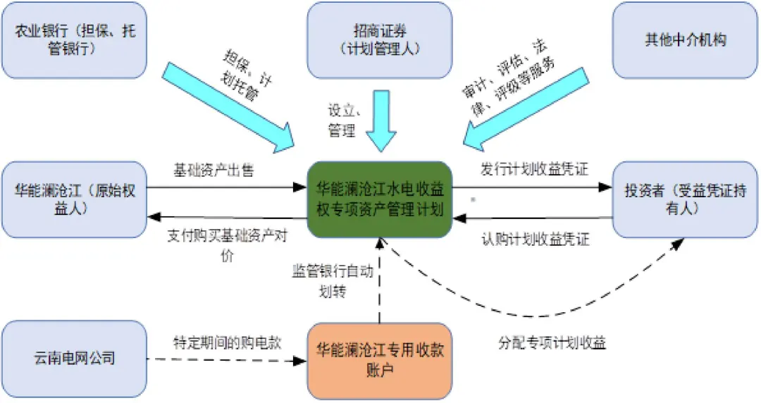 华能澜沧江水电收益权专项资产管理计划是典型的以准经营项目收益权作为基础资产的资产证券化项目。发起时,华能水电将漫湾一期水电站未来五年内合计24亿元水电销售收入转让给资产支持专项计划,接着专项计划以此为基础发行总面额20亿元的专项计划受益凭证。其中,优先级收益凭证19.8亿元,向投资者公开募集;次级收益凭证2000万元由华能水电持有。招商证券作为计划管理人负责对计划账户内资金进行管理。