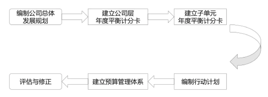 基于平衡计分卡的量化战略管理主要包括编制公司总体发展规划、建立公司层年度平衡计分卡、建立子单元年度平衡计分卡、编制行动计划、建立预算管理体系、评估与修正六个步骤,具体如下: