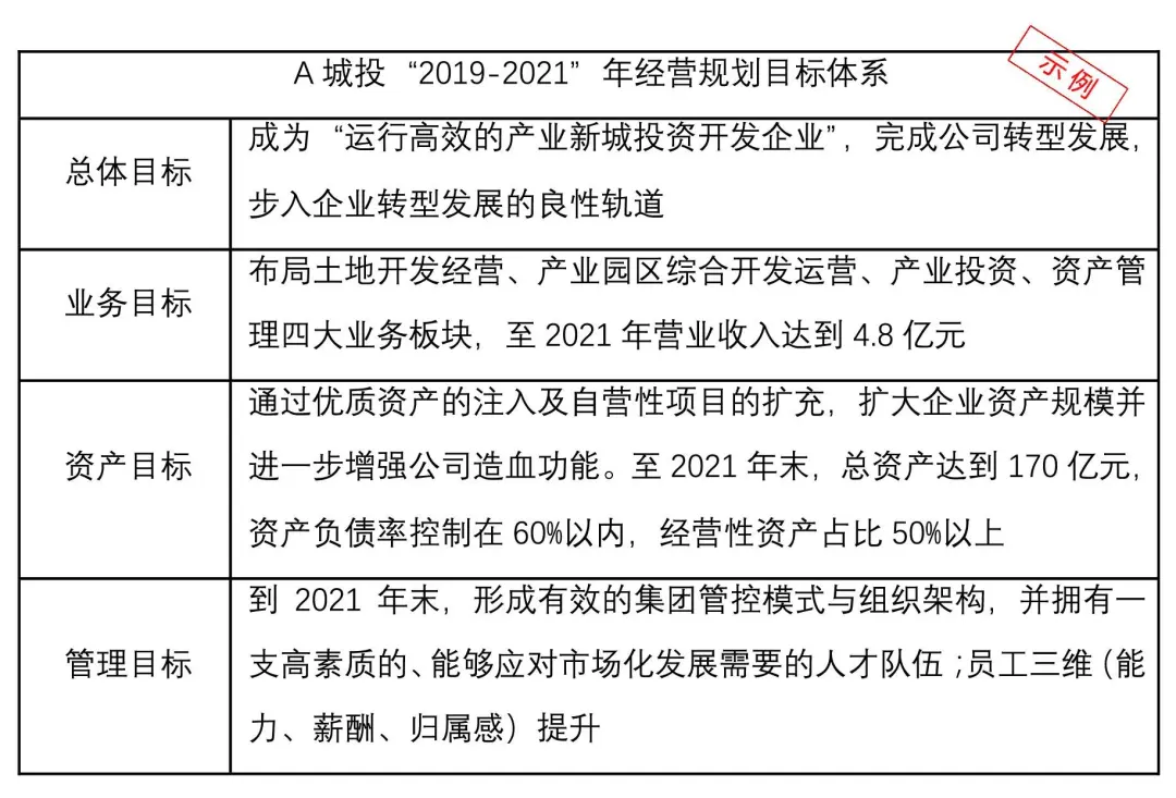 总体发展战略的编制需综合企业内部的优势与不足、外部的机遇与挑战来制定,非本文探讨重点。本文着重围绕总体战略制定后的进一步量化与管理工作展开。以某园区开发类城投公司为例(以下简称“A城投”),其于2018年度制定了“2019-2021”年度公司经营规划,目标体系如下: