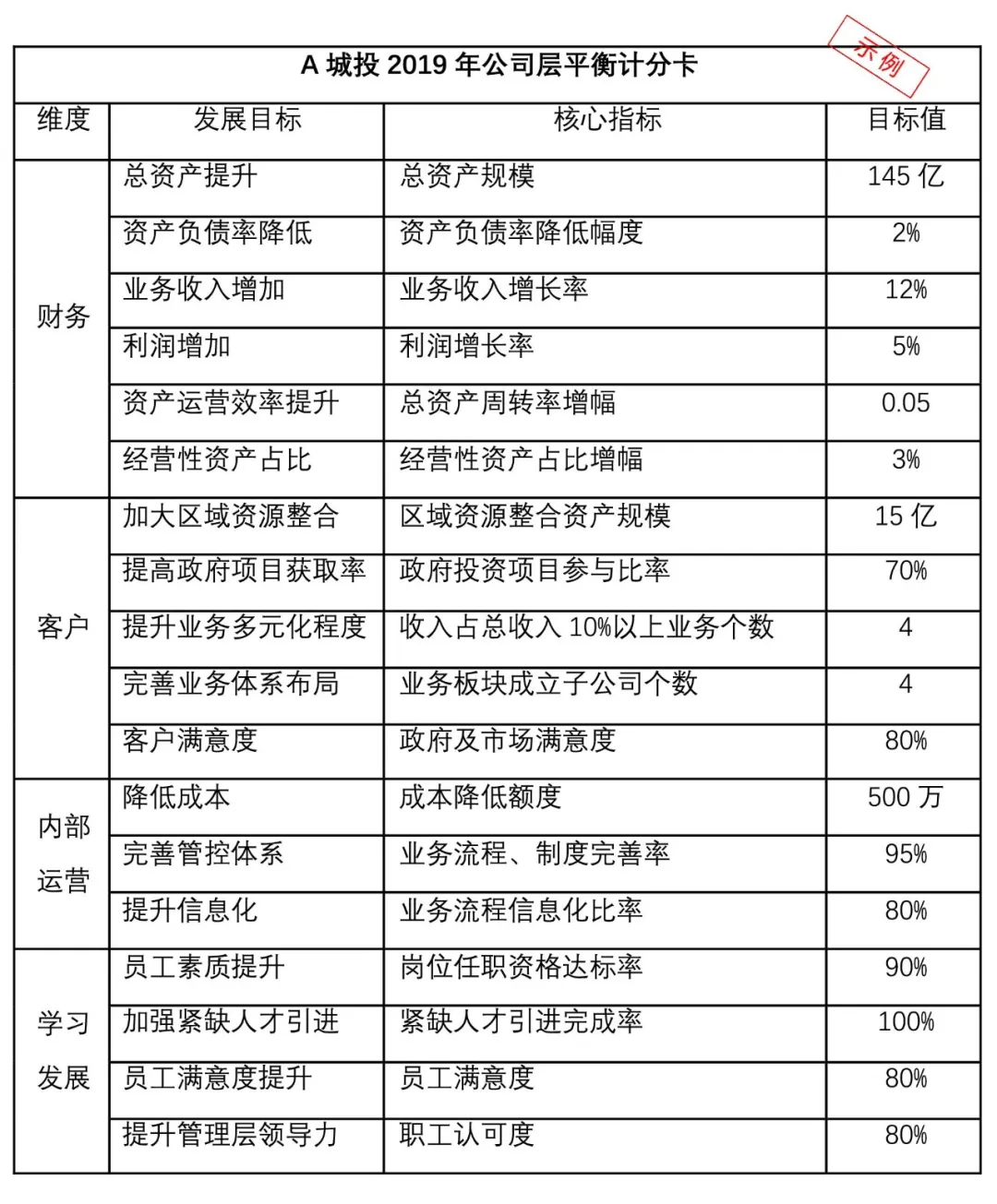 基于A城投2019-2021年度经营规划目标体系,借助平衡计分卡,从财务、客户、内部运营、学习发展四个方面建立其2019年度公司层平衡计分卡。财务方面关注总资产、资产负债率、业务收入、净利润、资产运营效率、经营性资产占比;客户方面关注区域资源整合、政府性项目占有率、业务多元化程度、业务体系布局;内部运营方面关注控制成本、管控体系、信息化等;学习发展方面关注紧缺人才引进完成率、管理层领导力、员工三维提升等。具体指标的确定可以企业往期数据及公司整体战略目标的分解而定,制定的平衡计分卡如下: