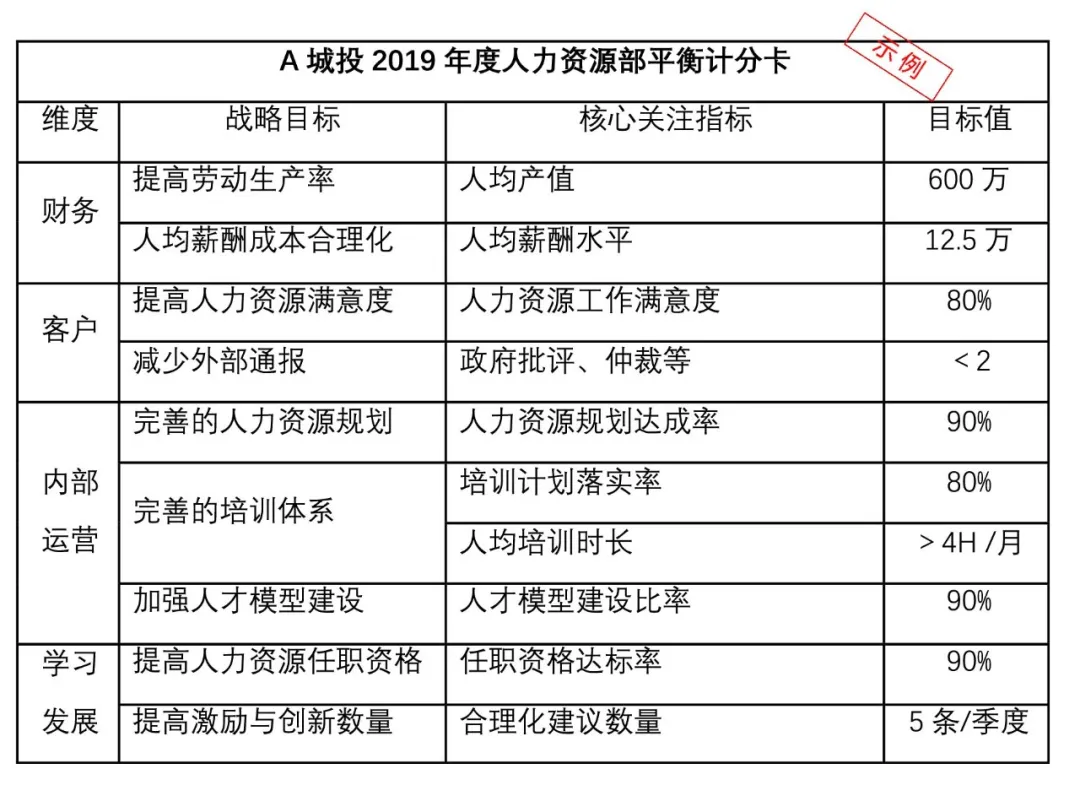 在完成公司层平衡计分卡的制作后,A城投的各业务部门需要根据公司的平衡计分卡针对制定部门的平衡计分卡。以A城投人力资源部为例,从财务、客户、内部运营、学习发展四个维度制定A城投人力资源部2019年度平衡计分卡。财务维度应关注人均产值、人均薪酬等;客户维度重点考核人力资源工作内部满意度、岗位任职达标率等;内部运营维度主要关注人力资源规划完成度、内外部培训完成度等;学习发展维度核心关注人力资源任职资格达标率、员工合理化建议数量等。可制作人力资源部平衡计分卡如下: