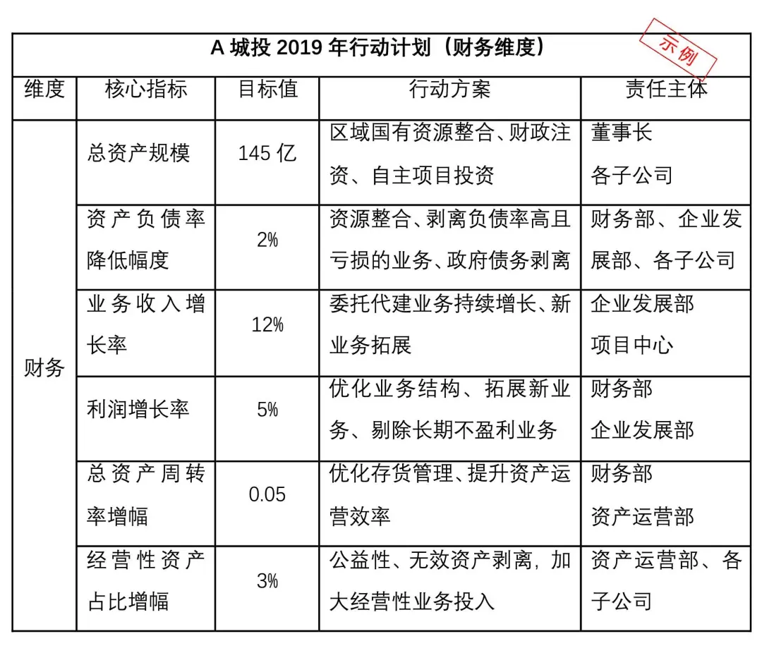 行动计划表的编制是战略实施的第一步,它可以把量化的战略指标落实到各职能部门,根据战略指标达成率推进企业绩效考核。行动计划的编制需要建立在平衡计分卡的基础上,以A城投财务维度为例编制行动计划如下: